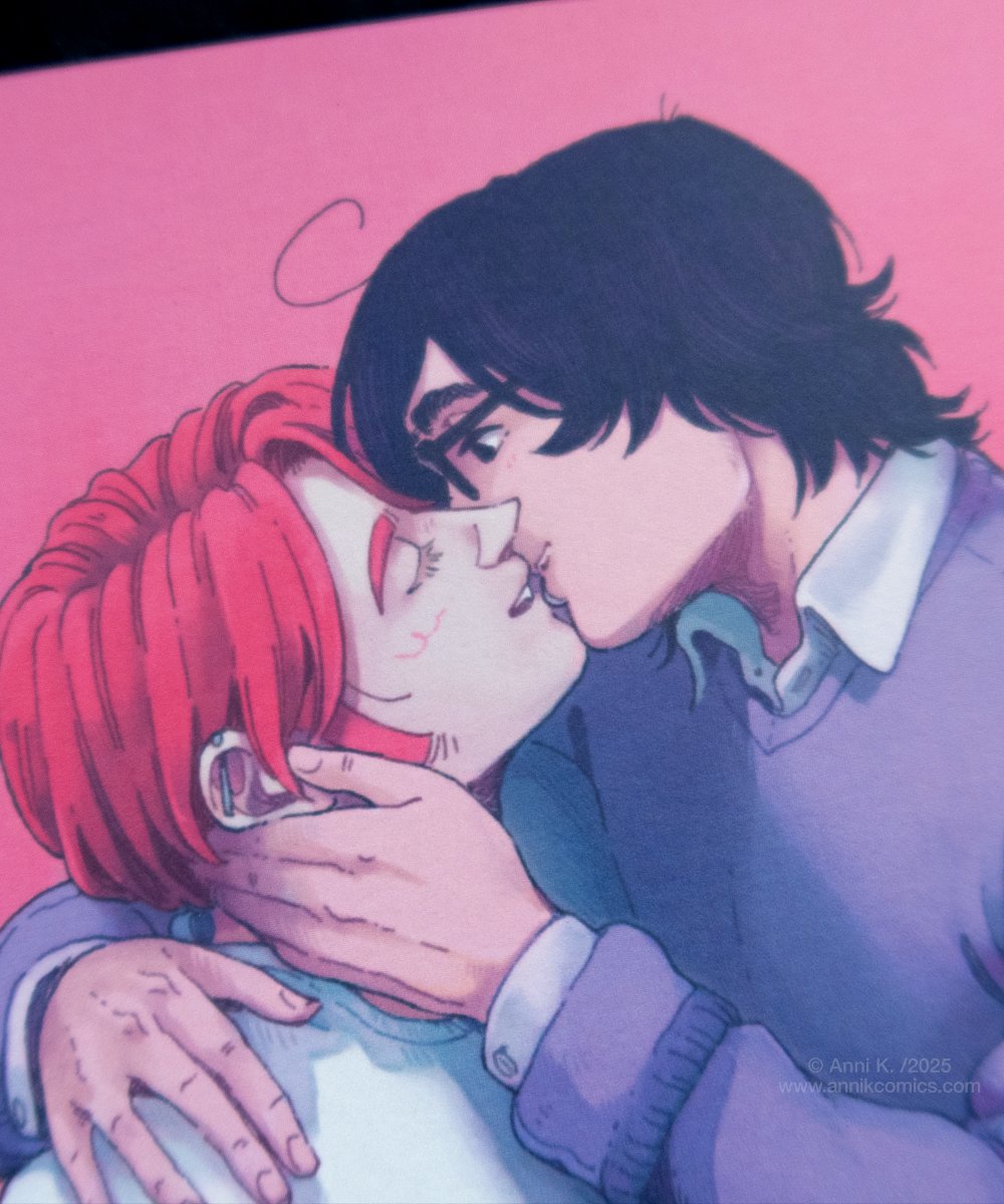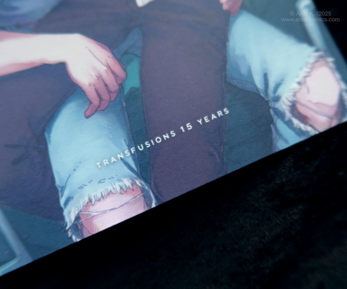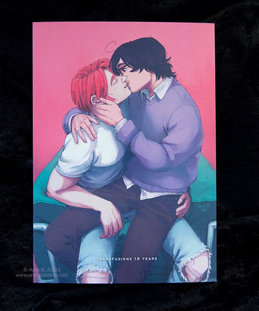 Two different prints to celebrate the 15th anniversary and the finale of the webcomic Transfusions, featuring the main characters Joa and Dylan.